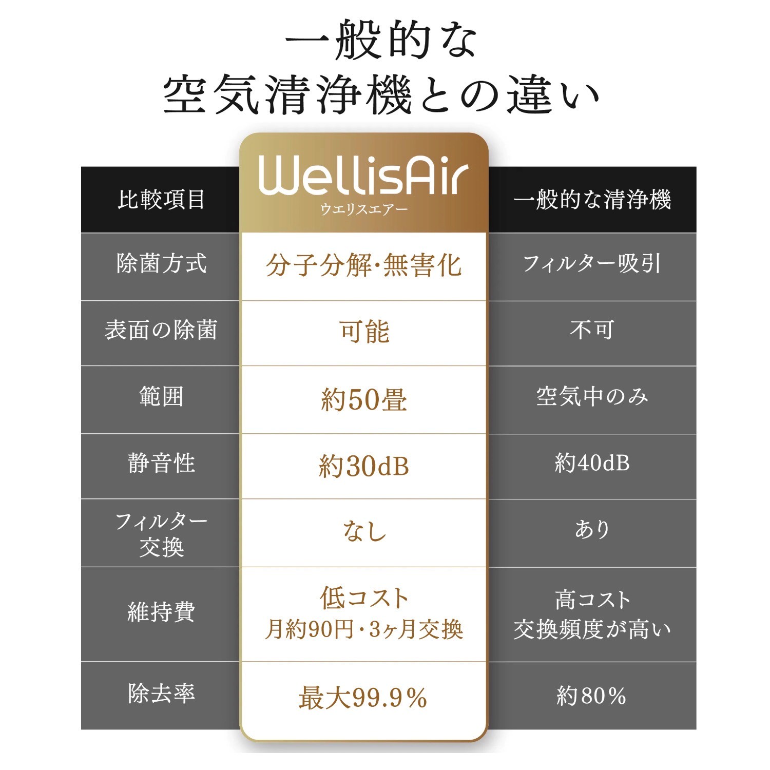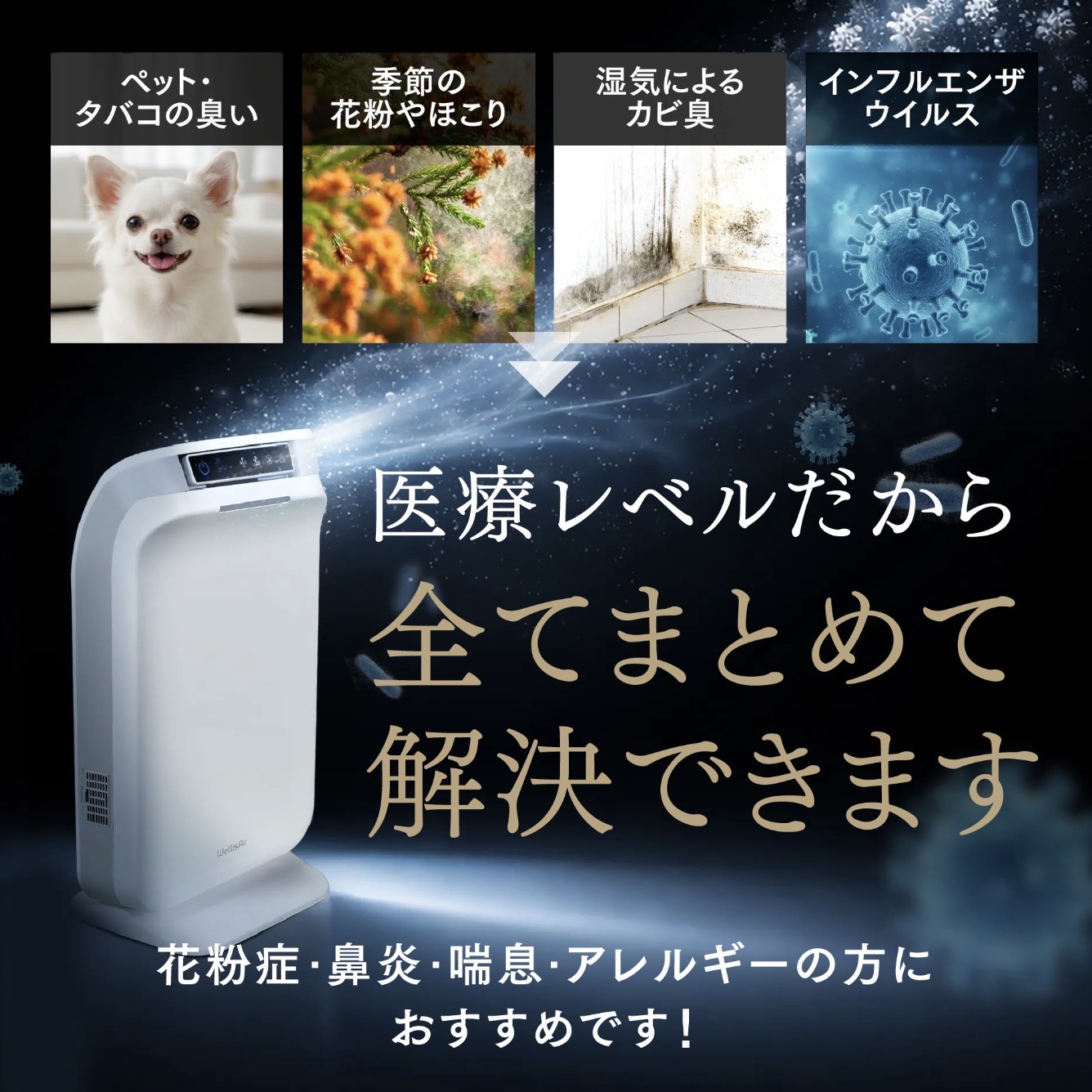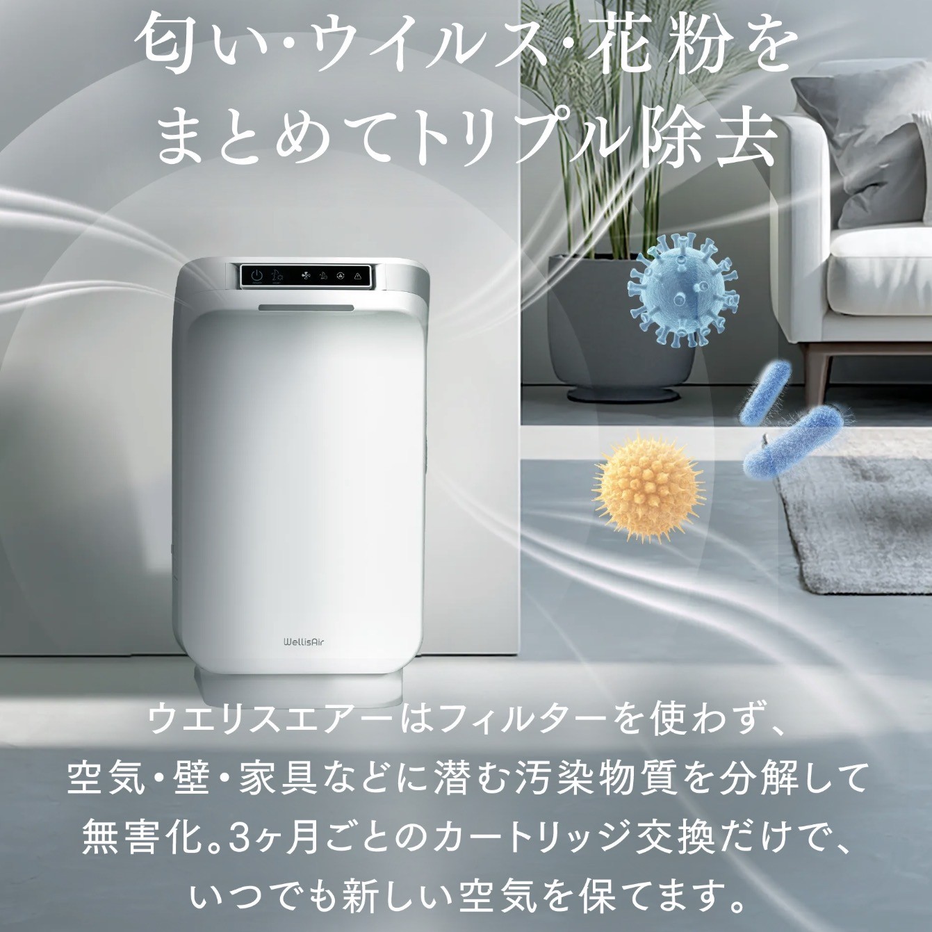 - ウエリスエアーは自然の大気浄化方式を採用し、人体に無害で最も環境にやさしい方法として自然の浄化物質であるOH(ヒドロキシラジカル)を大気レベル に豊富に生成し、各種汚染物質(臭い、バクテリア、ウイルス、細菌、カビなど)を実質的に除去します。